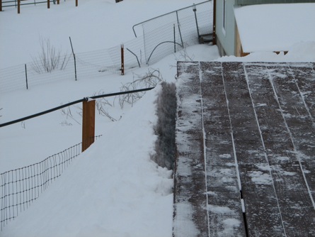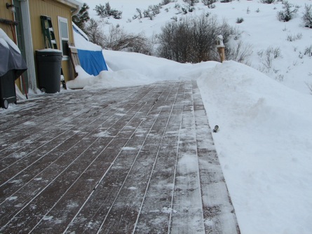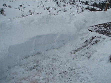 ![]() Note that the end of the deck that you're looking at is 5 ft off the ground. The good news is the weight of the snow causes it to slide slowly downhill, which makes more room to stick snow. |