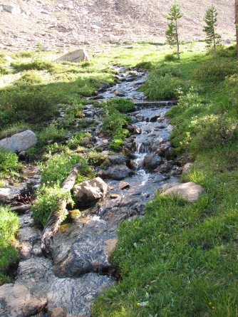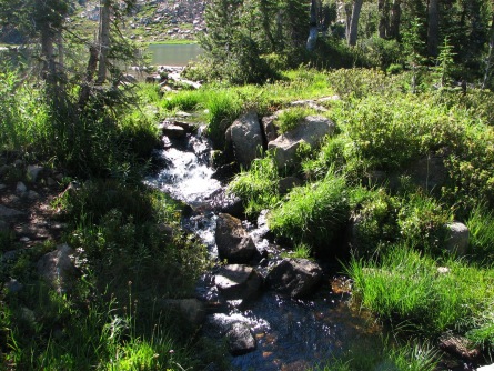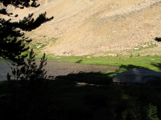 ![]() Looking out to the lake from the campsite. The chipmunks here were many, fat and without fear. They chewed on June's pack twice trying to get at the goodies. Many a pine cone was launched in thier direction. |