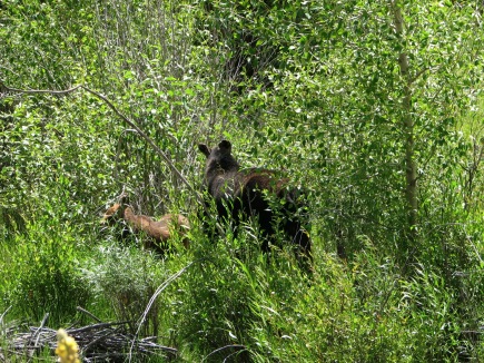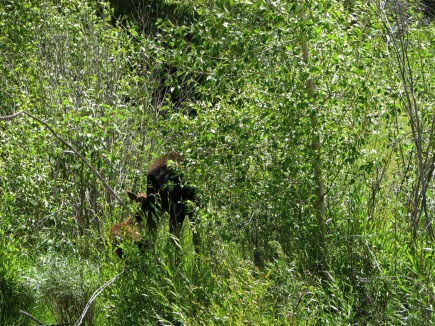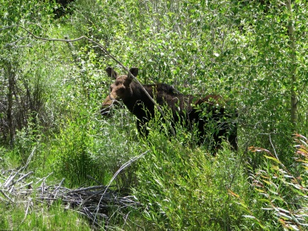 Mrs. Moose, grazing on the willows. Jr. is hiding behind.