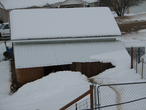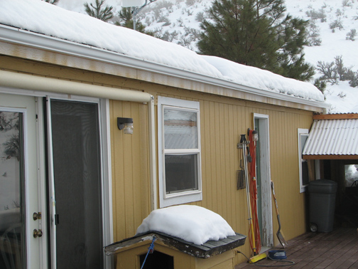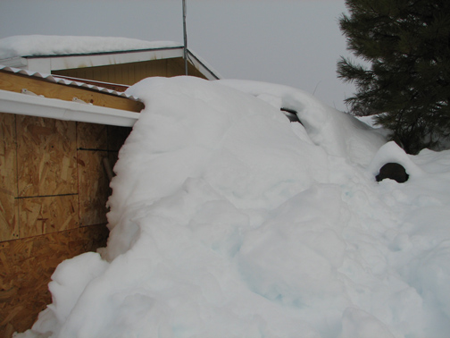 The snow has slid off the roof by now, but so much as fallen that it is almost as high as the roof itself |