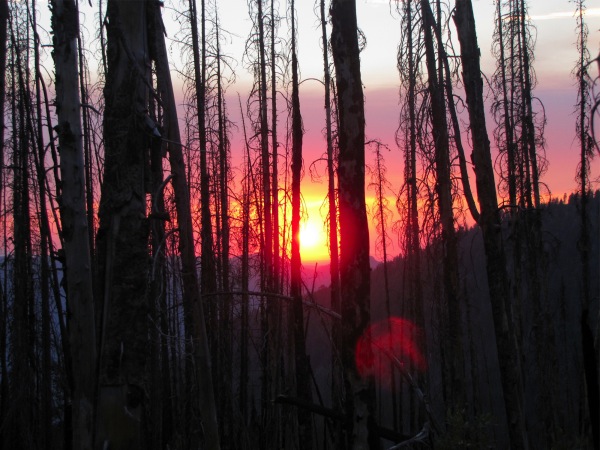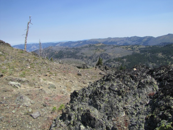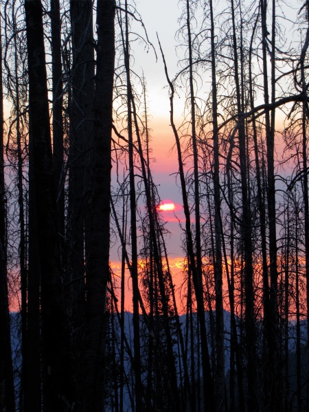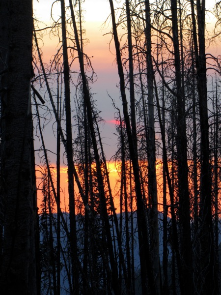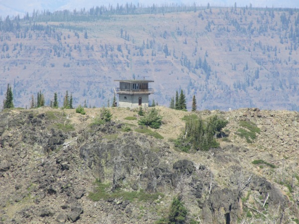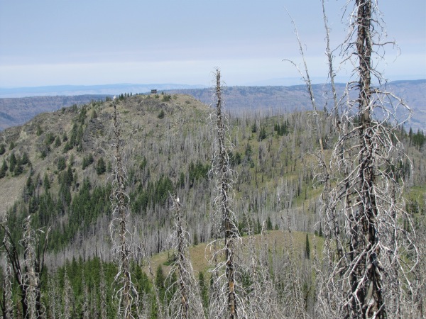 ![]() Dry Diggins lookout in the distance... through the burned-out stubs. From the lookout you can see the Snake River and much of Hells Canyon. |