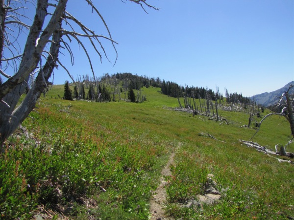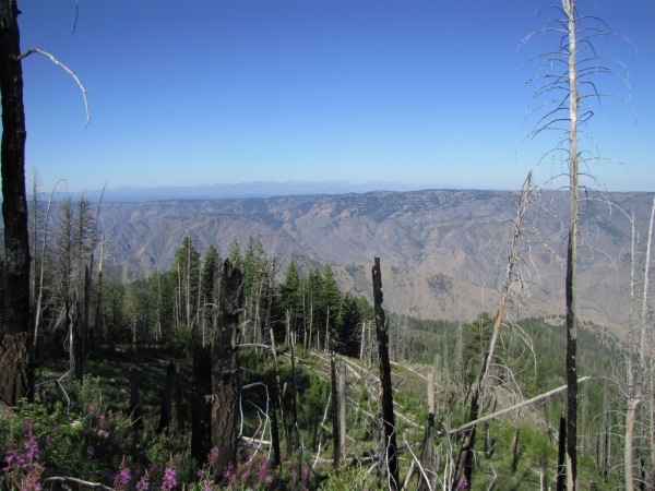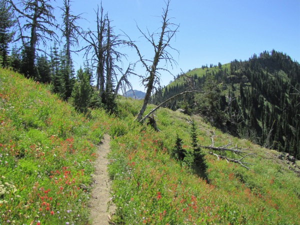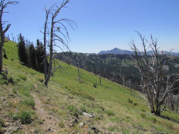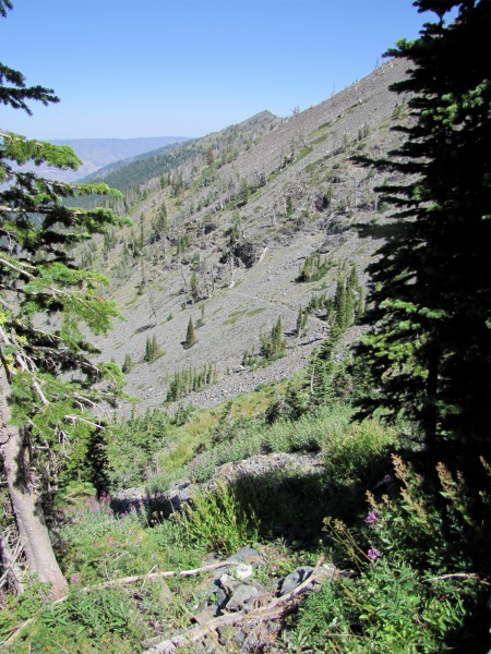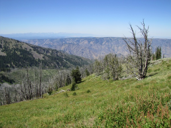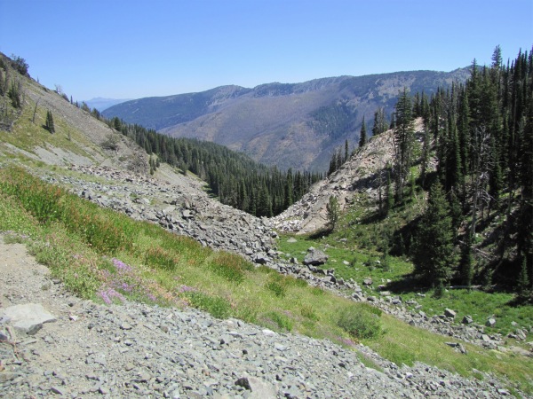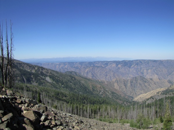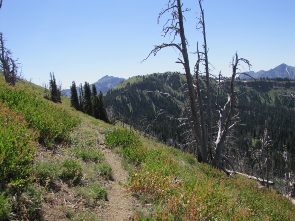 From Baldy Lake, NW & down to a trail junction, then south all the way to the south end of the Seven Devils range. Across a ridge at that point, the back up north