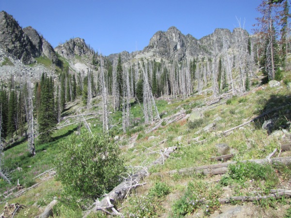 From Dog Creek CG, climb up the Dog Creek drainage, over, under and around all the detritus left from past fires, up and into the wrong cirque, saw some beautiful Mountain