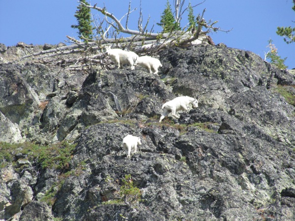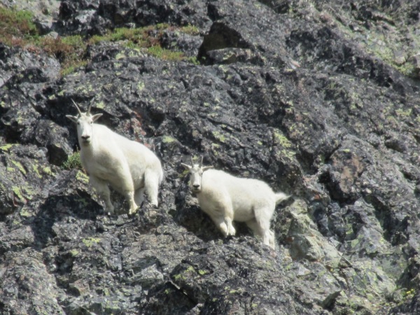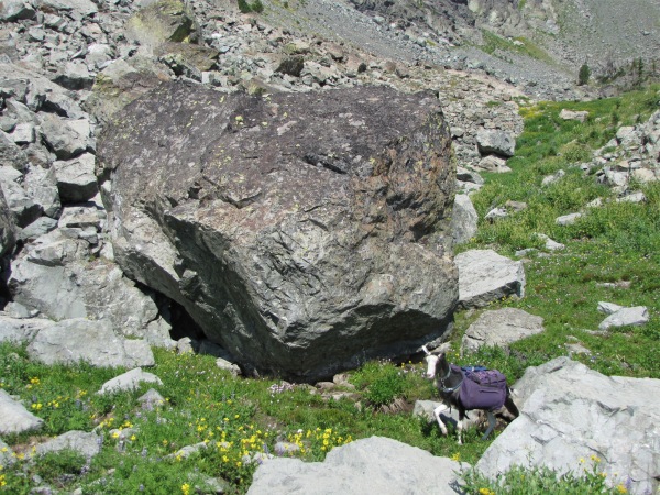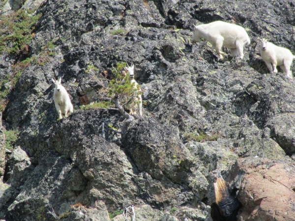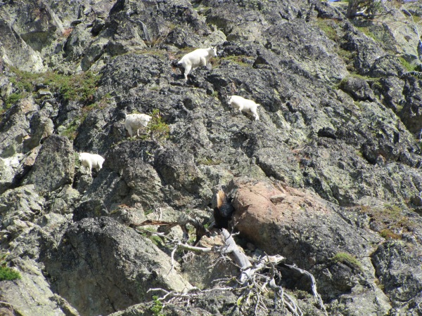 Goats, a mid-course correction, and back over to the Dog Creek drainage, then Dog Lake. After lunch, Larry continues alone on walkabout over the ridge to the