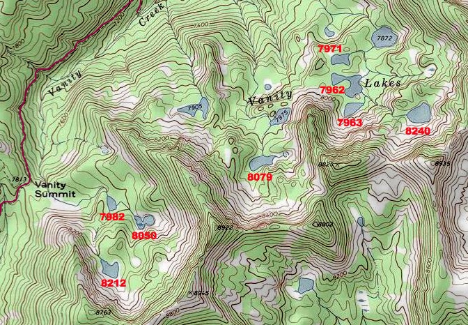 ![]() 'Lunch lake', or in reality, Lake 7905. Where we 'lunched' after rounding the very steep and challenging east-west ridge between the drainages. |