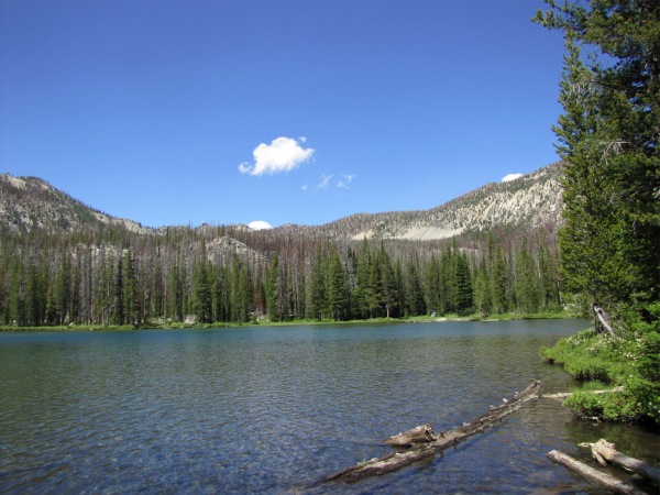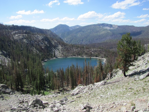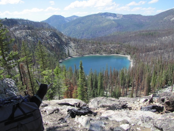 Arriving at the lake, we began to look for a place to set up camp that was: 1) not burned to a crisp; and 2) not a place where we would have to spend the night listening for a tree falling onto the tent. As a result, we completely circuited the lake, and found nothing.