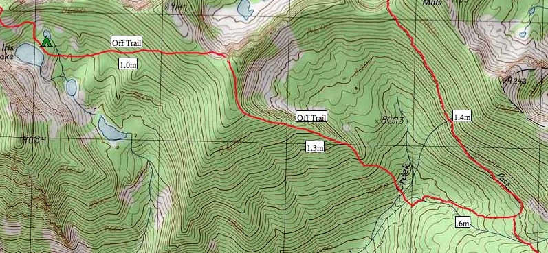 On the way out, we climbed up and away from Iris, then down the long ridge to the east, through the Fall Creek drainage, a real deep cut in this area, and reunited with the trail to the top of Ruffnect ridge |