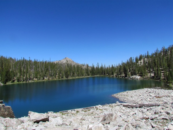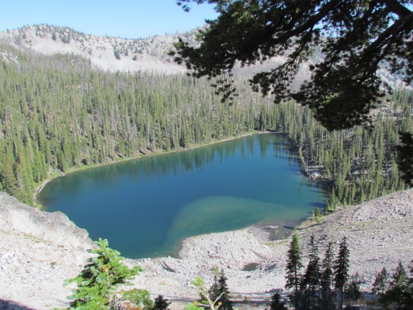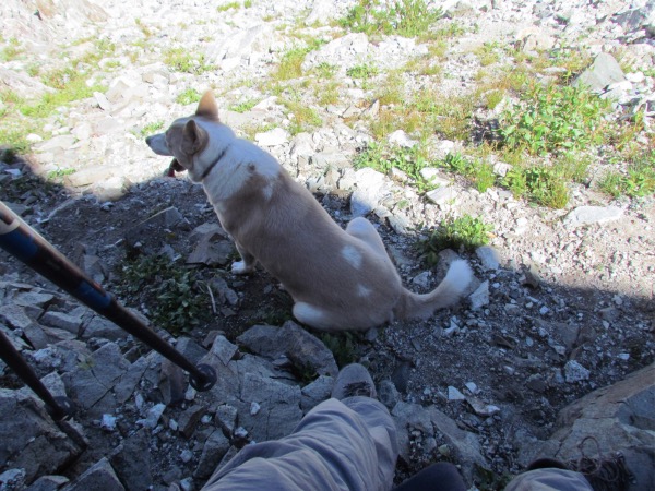 | The hike to this lake was done as a result of Bob Hultz contacting me via my website and suggesting a hike into this obscure lake. Always ready to go hiking, plans were made and away we went. The rub? It was a steep climb up to the top of the ridge, and an even steeper descent to the lake. On the way back up and out of the lake, my dog Maxie gave signs that he was going to pack it in, long before we reached the top of the ridge. It took a lot of coaxing to get him to complete the hike to the top. No more hiking for doggie! |