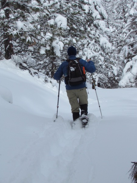 ![]() Hiking partner seems to be gifted with energy reserves well beyond mine, therefore he is subsequently blessed with the job of 'breaking trail'. If you have never snowshoed, you have no idea of the energy output that entails. |