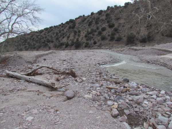 After the 1" or more of rain we had a few nights ago, Whitewater Creek gained enough watery momentum to cause a fair amount of damage in the Whitewater Basin. The Catwalk is closed because the approaches are buried in a fair amount of debris, sand and rocks. |