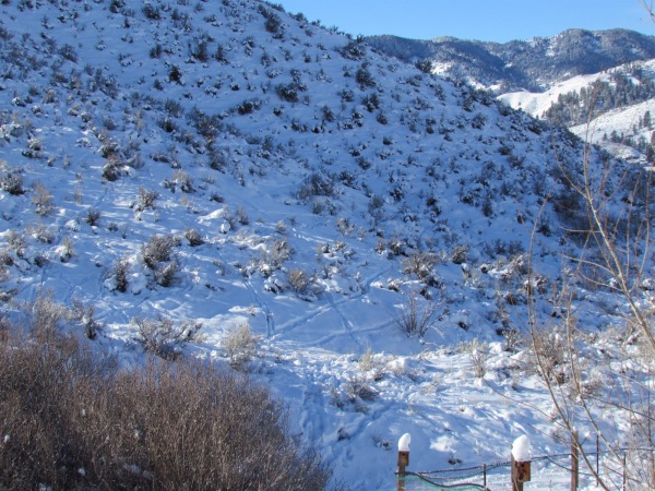 ![]() The elk have tracked up my nice snow-covered hill! |